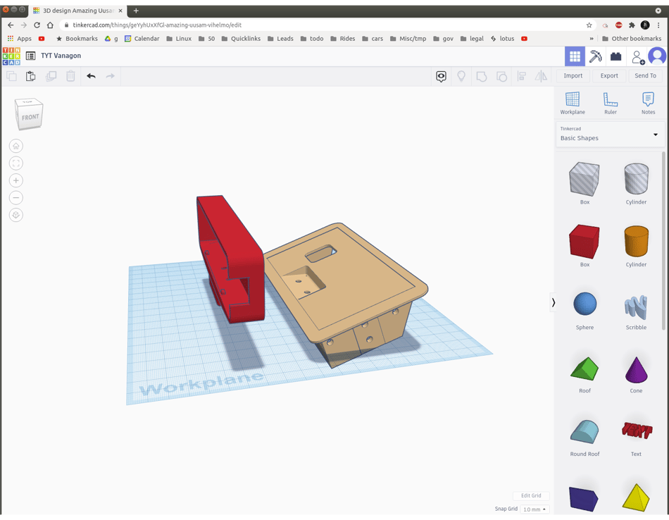Here's a shot of the project I'm working on today for the Vanagon. I'm integrating the face plate of my ham radio into a mount at the ashtray on the dash. This is how it looks in Tinkercad ready to print.