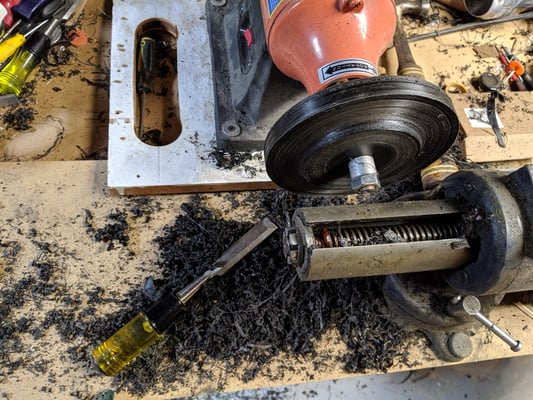 I decided that a 3/4" spacer would be a good place to start to balance out the ride height. I bought a 1" thick High Density Polypropylene cutting board, because HDPP turned up as a choice for custom spacers in similar applications. After that I just made it happen with what I had. The desire was to make a 3/4" spacer, and leave a 1/4" lip to seat inside the rubber cup that holds the top of the spring in place.