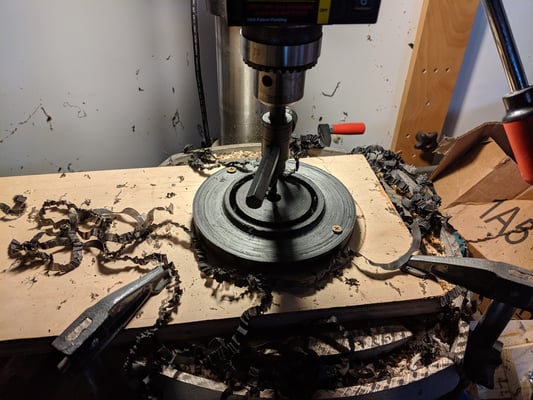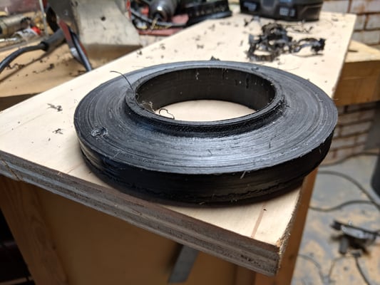 I ended up using a hole cutter for the basic shape, and a middle step where I used a polisher as a make shift lathe ending up with something very similar to the aluminum version I'd seen online.